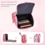 این کیف یک کولهپشتی با طراحی رنگهای پاستلی است. روی جیب جلویی کیف، تصویر یک دایناسور سبز با یال زرد رنگ قرار دارد. بالای طرح کیف کلمه “Scorpio” نوشته شده است. همچنین، نماد برج عقرب (♏) به رنگ قرمز دیده میشود. بخش اصلی کیف به رنگ سرمه ای است. بندهای شانهای طبی و ضد عرق هستند و زیپ کیف مدرسه با کیفیت است.